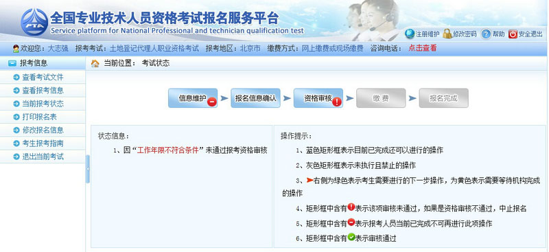 如果资格审核不通过,考生可以通过考试状态页面的状态信息栏查看到资格审核不通过的原因,如确实不符合报考条件,可以点击左侧【修改报名信息】修改报名条件重新进行报名信息确认,等待考试机构审核。(见下图)。