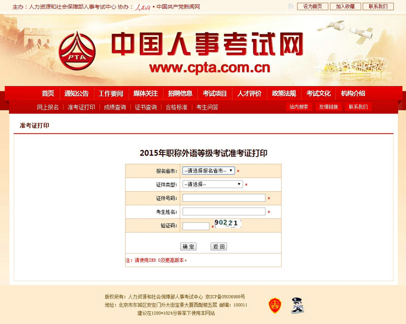 考生缴费成功后,完成了所有的网上报名相关工作,按当地考试机构规定的时间,登录中国人事考试网通过准考证打印功能打印准考证(见下图)。