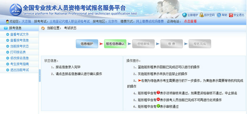界面左侧显示状态信息,右侧显示操作提示,请报考人员参考上述信息进行相关操作,直到报名完成。