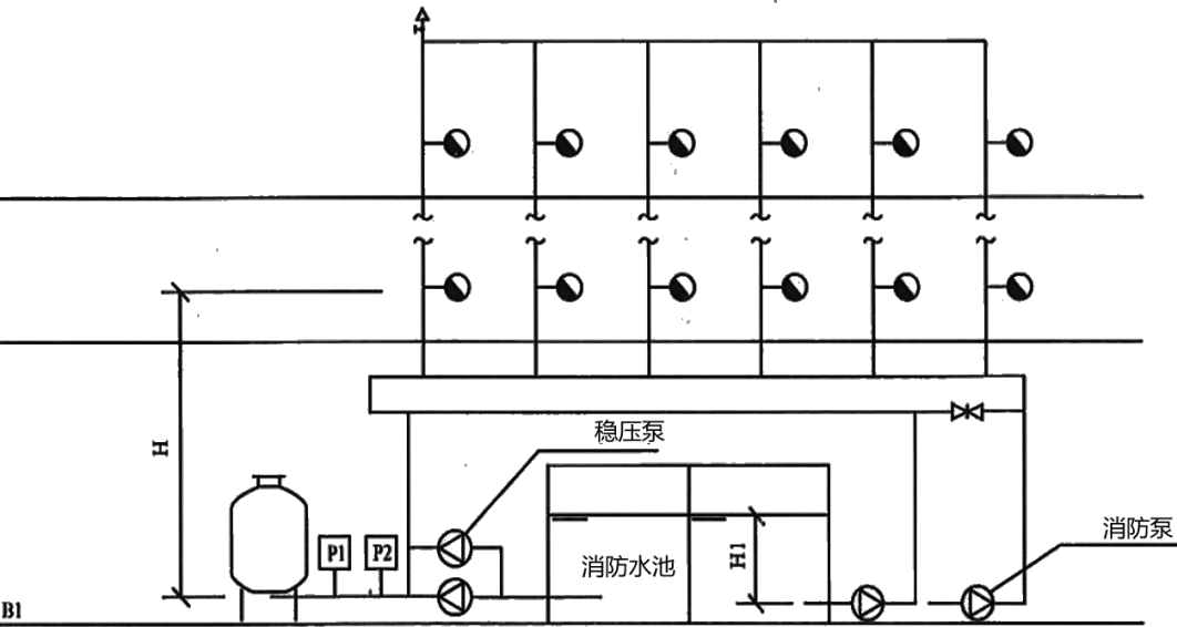 Z——最不利点喷头与消防水池的最低水位或系统入口管中心线之间的高程差,当系统入口或消防水池高于最不利点处喷头时,Z应取负值(MPa);