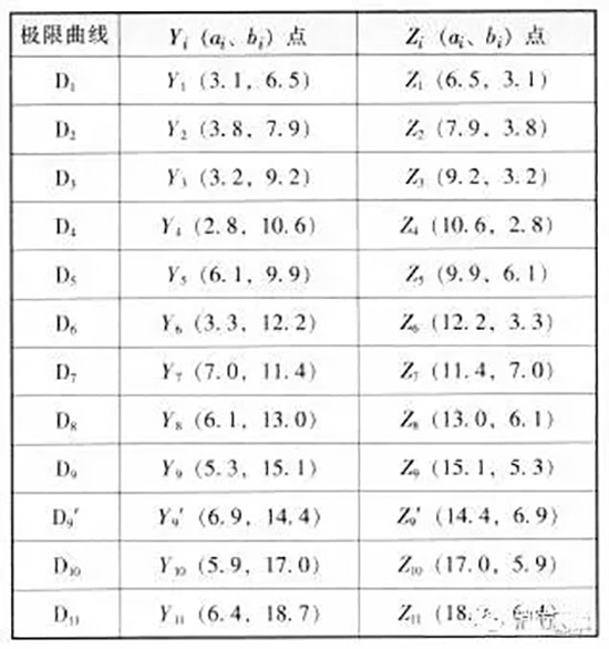 表3极限曲线端点Yi和Zi坐标值(ai、bi)
