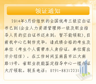 从江西省职业资格工作网了解到,江西省2014年5月份组织的全国统考职业(含人力资源管理师四三二一级、心理咨询师三二级、企业培训师三二一级、理财规划师三二一级、物流师四三二一级、秘书资格二级)三级空白证书已到,目前我中心已制作完毕,(人力资源管理师一级及职业指导人员的空白证书未到,暂不能领取),请成绩合格的考生和单及单位(考生个人需带本人身份证,单位需出示介绍信),在工作时间至南昌市江大南路19号,省职业技能鉴定指导中心一楼办证大厅领取。联系电话:0791-88312231