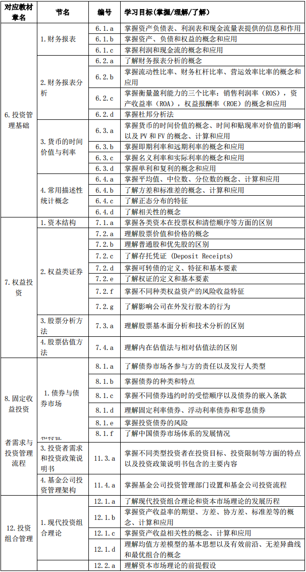 一、总体目标为确保基金从业人员掌握与了解基金行业相关的基本知识与专业技能,具备从业必须的执业能力,特设《证券投资基金基础知识》科目。