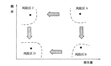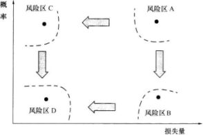 若某事件经过风险评估,它处于风险区A,则应采取措施,降低其概率,以使它移位至风险区B;或采取措施降低其损失量,以使它移位至风险区C。风险区B和C的事件则应采取措施,使其移位至风险区D。