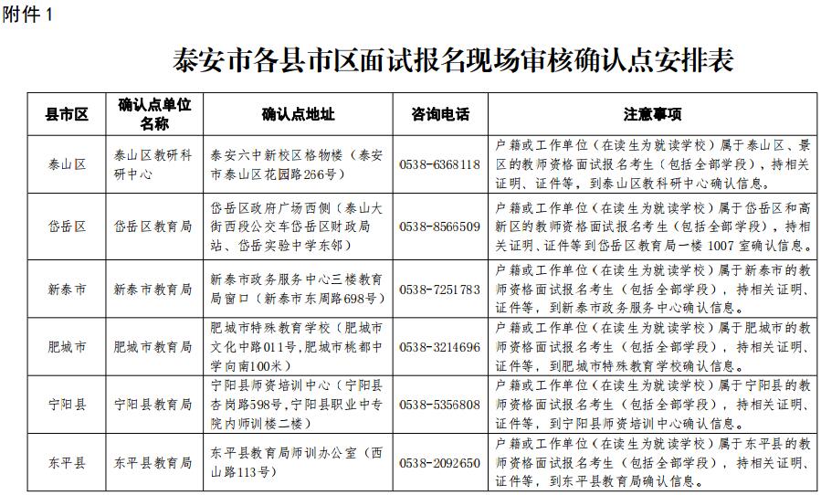 山东泰安市面试报名审核确认点安排表