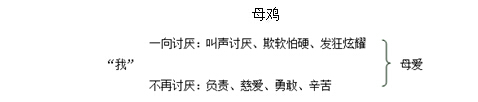 全文围绕着作者对“母鸡”的情感态度展开叙写,表面上是写了母鸡的负责、慈爱、勇敢和辛苦,塑造了一位“伟大的鸡母亲”的形象,作者对母鸡的情感也由“讨厌”转变为尊敬。实际上作者是在歌颂天底下所有神圣而伟大的母爱。