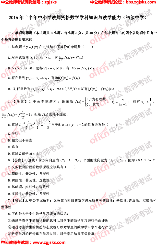 2015上半年教师资格证《初中数学学科知识》真题及答案(图文版)