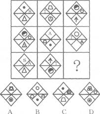 所给图形的右下角有一个问号,下列选项中,最适合填补该问号的是( )。