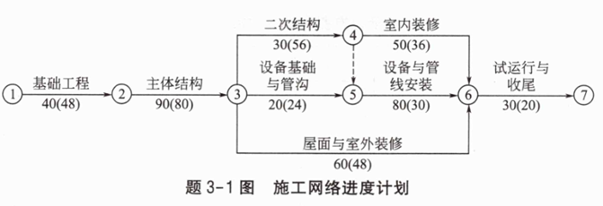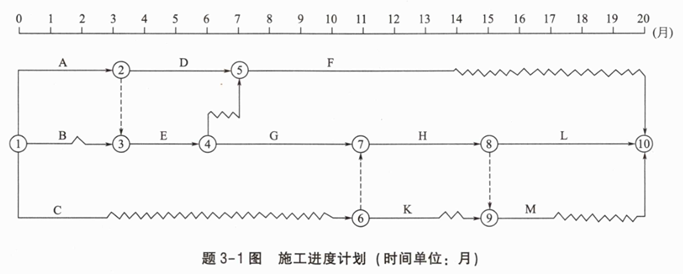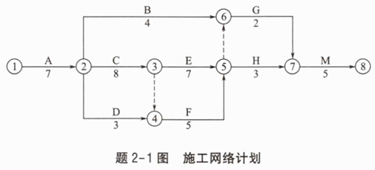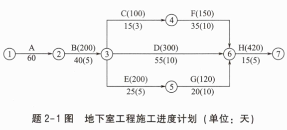 投标人C拟对该项目地下室工程的进度计划进行调整,初步进度计划如题2-1图所示,所有工作计划按最早开始时间安排,计划工期为170天。箭线上方括号外字母表示工作名称,括号内数字表示压缩一天所需的赶工费用(单位:元);箭线下方括号外数字表示该工作的持续时间(单位:天),括号内数字表示可压缩时间(单位:天)。