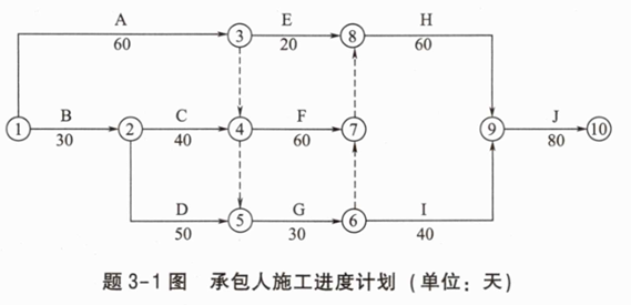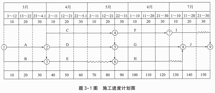 投标人D拟定的初步进度计划如题2-2图所示,计划工期290天,其中G、I、J共用一台机械,该机械原计划进场时间为第90天末,工作F、H的原计划结束时间分别为第150天、第210天。