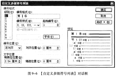 步骤2单击【多级符号】选项卡,单击【自定义】按钮,打开【自定义多级符号列表】对话框,如图9-6所示。