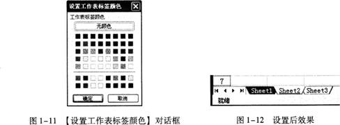 步骤2单击【格式】菜单→【工作表】→【工作表标签颜色】命令,打开【设置工作表标签颜色】对话框,如图1-11所示。