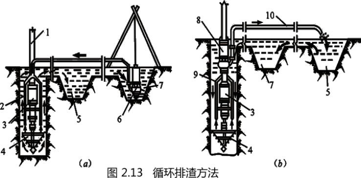 1-钻杆;2-送水管;3-主机;4-钻头;5-沉淀池;6-潜水泥浆泵;7-泥浆池;8-砂石泵;9-抽渣管;10-排渣胶管