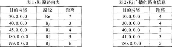 在使用RIP协议的互联网中,路由器Ri的路由表如表1所示。如果它收到其相邻路由器Rj广播的路由信息(如表2所示),那么到