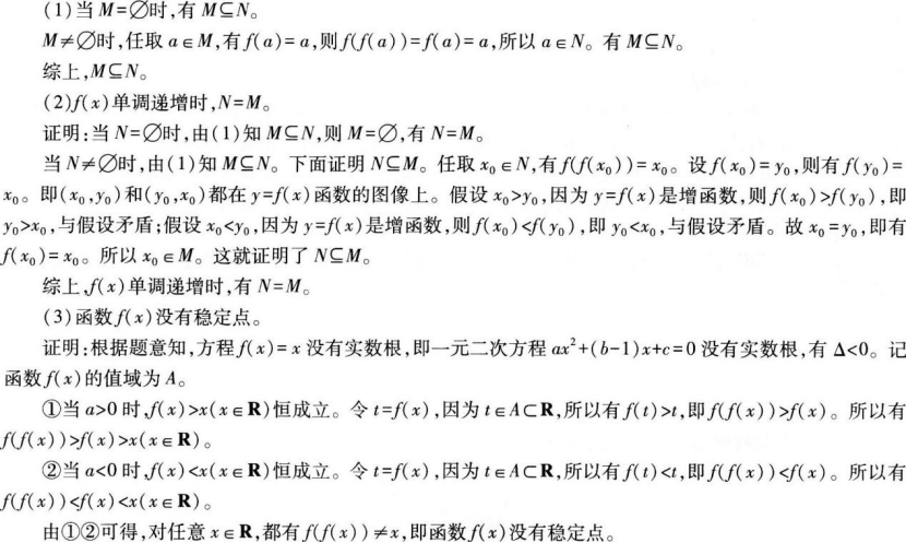 (3)已知函数f(x)=ax2+bx+c(a≠0),且f(x)没有不动点,问f(x)是否有稳定点?并证明你的结论。