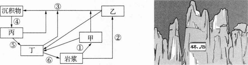 下面左图为岩石圈物质循环示意图,右图为石林景观。据此完成6~7题。
