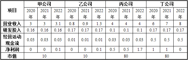 甲、乙、丙、丁均为拟上市公司(非软件企业),股本均为0.5亿股,2020—2022年情况见下表(单位:亿元)。