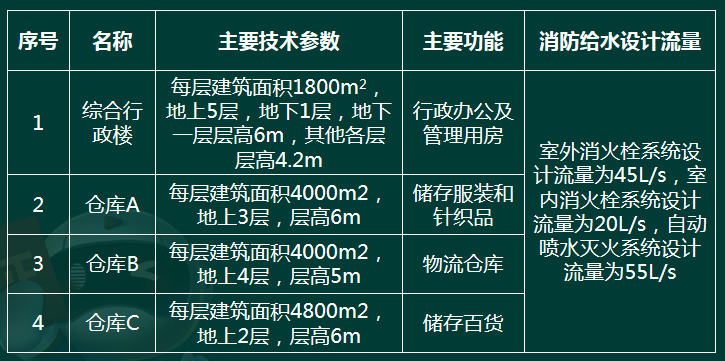 南方某仓库区占地面积10hm2,库区内设有多座仓库及配套服务建筑,各建筑物功能和技术参数见表。