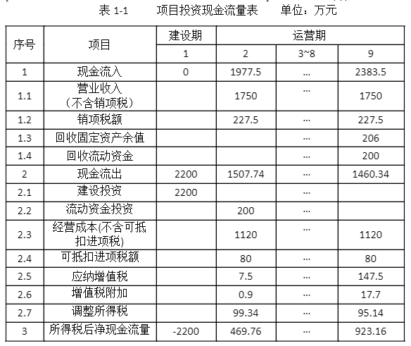 1.项目建设投资2200万元(含可抵扣进项税140万元),项目建设期1年,运营期8年,建设投资全部形成固定资产,固定资产使用年限8年,残值率10%,按直线法折旧。