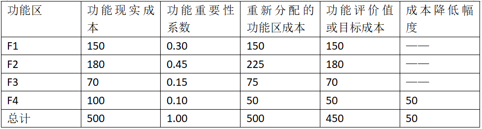 某产品目标总成本为1000元,各功能区现实成本及功能重要性系数见下表,则应降低成本的功能区有( )
