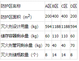 (1)对灭火剂储瓶间检查。灭火剂储瓶间设在B区和C区之间的专用房间内,门上标有“灭火剂储瓶间”标识;储瓶间共设置14只灭火剂钢瓶,均固定在灭火剂瓶架上,每只钢瓶固定铭牌的内容为:(灭火剂:七氟丙烷,充装压力:5.6MPa,容积:100L,钢瓶编号:1~14#)。设有4只N2储瓶,储瓶正面油漆喷涂编号(A区、B区、C区、D区);检查驱动管路、连接管、集流管、选择阀及附件安装情况,查看安全泄压装置动作压力,检查发现驱动管路低泄高封阀均安装在选择阀与灭火剂钢瓶之间驱动管路的最末端,集流管上未安装低泄高封阀。检查发现有1只灭火剂储瓶压力低于相应环境温度下充装压力的90%。经向业主了解,灭火剂再充装可在36h内完成。