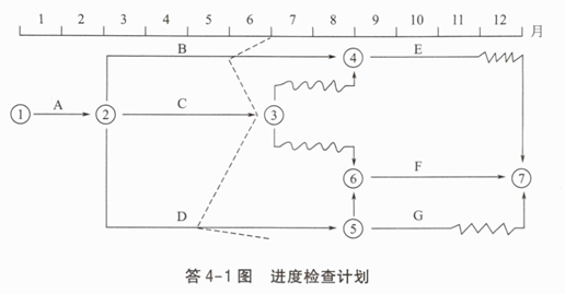 1.绘制实际进度前锋线,见答4-1图。