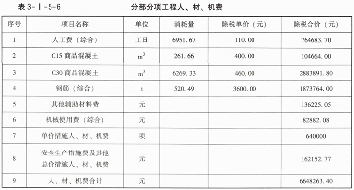 2.根据问题1的计算结果,在答题卡中列式计算该分部分项工程人工、材料、机械使用费消耗量,并在答题卡表3-I-5-3中,计算该分部分项工程人、材、机费,施工企业结合相关方批准的施工组织设计测算的项目模板工程人、材、机费为640000.00元;施工企业内部规定安全生产措施及其他总价措施费的人、材、机费按分部分项工程人、材、机费及模板工程人、材、机费之和的2.50%计算。
