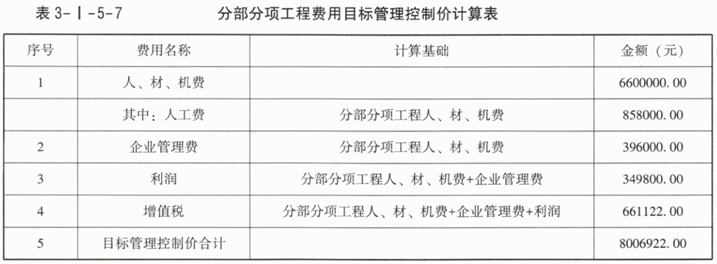 4.假定该钢筋混凝土基础分部分项工程人、材、机费为6600000.00元,其中人工费占13%,企业管理费按人、材、机费的6%计算,利润按人、材、机费和企业管理费之和的5%计算,增值税税率按9%计取。请在答题卡表3-I-5-4“分部分项工程费用目标管理控制价计算表”中编制该钢筋混凝土基础分部分项工程费用目标管理控制价。