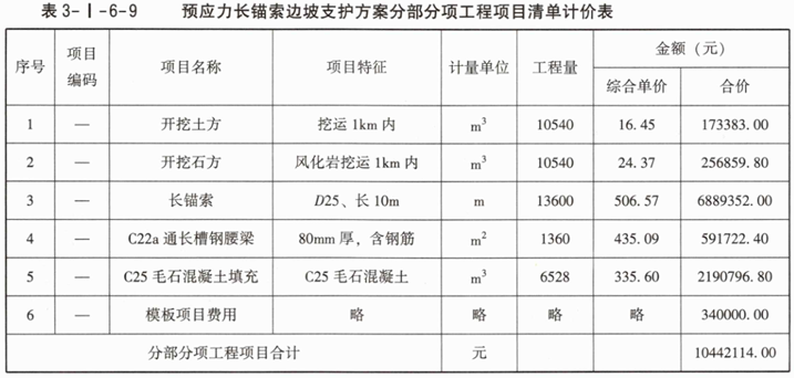 3.已知C22a通长槽钢腰梁综合单价为435.09元/m、C25毛石混凝土填充综合单价为335.60元/m³,模板项目费用测算结果为340000.00元。根据问题1和问题2的计算结果,以及表3-I-6-1中相应的综合单价、答题卡表中相关的信息,按现行国家标准《房屋建筑与装饰工程工程量计算标准》GB/T50854—2024的计算规则,在答题卡表3-I-6-5中,编制该预应力长锚索边坡支护方案分部分项工程项目清单计价表。