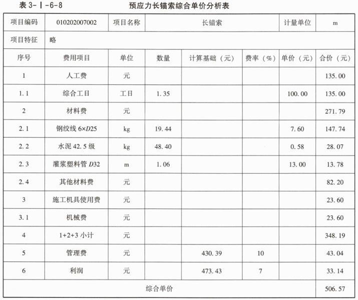 2.若企业管理费按人工、材料、机械费之和的10%计取,利润按人工、材料、机械、企业管理费之和的7%计取。根据表3-I-6-3中的数据,按现行国家标准《建设工程工程量清单计价标准》GB/T50500—2024的计算规则,在答题卡表3-I-6-4中,编制该预应力长锚索综合单价分析表[预应力长锚索工程量计量方法,基础定额与清单规范相同,均按设计图示尺寸,以长度(m)为单位]。