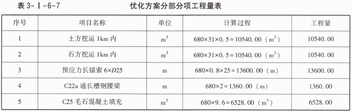 某矿山尾矿库区内680.00m长排洪渠道土石方开挖边坡支护设计方案及相关参数如图3-I-6-1所示,设计单位根据该方案编制的“长锚杆边坡支护方案分部分项工程项目清单计价表”,如表3-I-6-1所示。鉴于相关费用较大,经造价工程师与建设单位、设计单位、监理单位充分讨论研究,为减少边坡土石方开挖及对植被的破坏,消除常见的排洪渠道纵向及横向滑移安全隐患,提出了把排洪渠道兼作边坡稳定的预应力长锚索整体腰梁的边坡支护优化方案,相关设计方案和参数如图3-I-6-2所示。