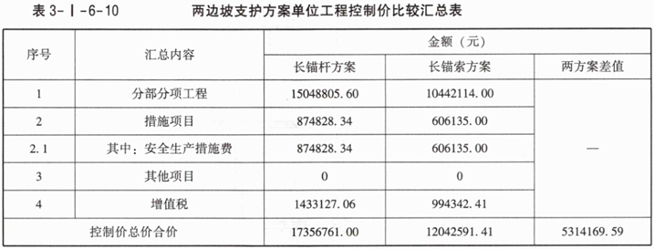 4.若措施费仅有安全文生产措施项目费,长锚杆方案安全生产措施项目费为874828.34元,长锚索方案安全生产措施项目费为606135.00元,其他项目费用为零,增值税税率按9%计取。利用表3-I-6-3和问题3相应的计算结果,按《建设工程工程量清单计价标准》GB/T50500—2024的计算规则,在答题卡表3-I-6-6中,编制两边坡支护方案单位工程控制价比较汇总表(两方案差值为长锚杆方案与长锚索方案控制价的差值)。(无特殊说明的,费用计算时均为不含税价格。)