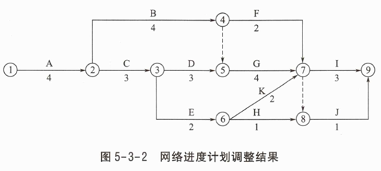 3.(1)工期索赔和增加K工作后的网络进度计划调整结果,如图5-3-2所示。