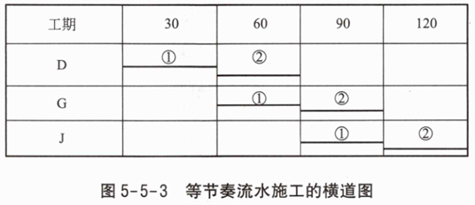 4.D、G、J三项工作等节奏流水施工的横道图见图5-5-3。