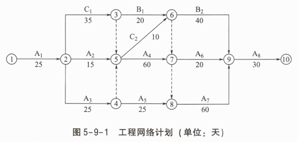 某环保工程项目,发承包双方签订了工程施工合同,合同约定:工期270天;管理费和利润按人材机费用之和的20%计取;增值税按人材机费、管理费和利润之和的9%计取。人工单价按150元/工日计,人员窝工补偿按其单价的60%计;施工机械台班单价按1200元/台班计,施工机械闲置补偿按其台班单价的70%计。人员窝工和施工机械闲置补偿均不计取管理费和利润;各分部分项工程的措施费按其相应工程费的25%计取(无特别说明的,费用计算时均按不含税价格考虑)。承包人编制的施工进度计划获得了监理工程师批准,如图5-6-1所示。