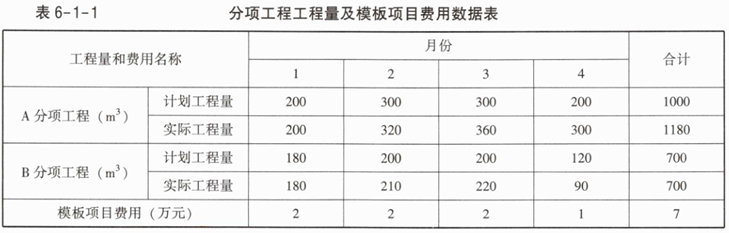 某工程项目发包人与承包人签订了施工合同,工期4个月,工程内容包括A、B两项分项工程,综合单价分别为360.00元/m³、220.00元/m³;管理费和利润为人材机费用之和的16%;增值税为人材机费用、管理费和利润之和的10%,各分项工程每月计划和实际完成工程量及模板项目费用见表6-1-1。