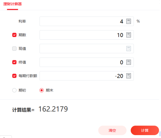 使用理财计算器,I/Y(利率)=4%;N(期数)=10;FV(终值)=0(贷款余额为0);PMT(每期付款额)=-20(注意符号,因为这是现金流出),代入计算PV如下图