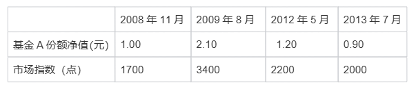 基金A成立于2008年11月,其份额净值为市场指数在变化的情况下,如下表所示,基金未进行分红。以下表述正确的是()