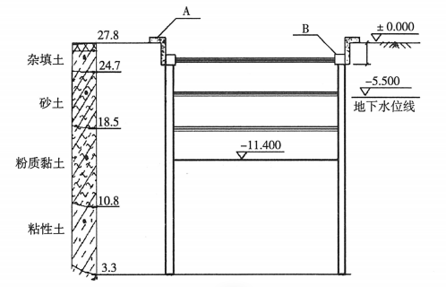 简答题某地铁隧道总长 646.8m,宽21m,全长划分6段分段进行基坑施工,其中2号基坑长107.8m,宽 21.05m,基坑深度11.4m,地铁车站2号基坑横断面示意图如图所示。基坑采用地下连续墙十三道钢管内支撑支护,地下连续墙厚度0.8m。在基坑围护结构施工范围内土体中含有丰富的潜水,地面以下最大埋深15.8m。