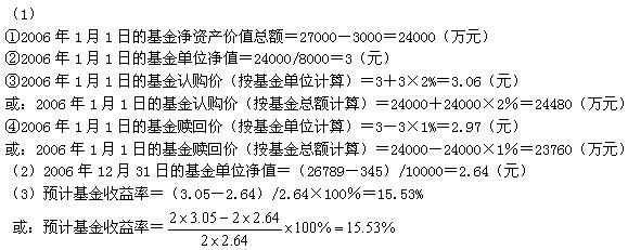 资料一:2006年1月1日,ABC公司的基金资产总额(市场价值)为27000万元,其负债总额(市场价值)为3000万元,基金份数为8000万份。在基金交易中,该公司收取首次认购费和赎回费,认购费率为基金资产净值的2%,赎回费率为基金资产净值的1%。