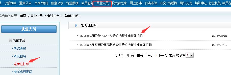 3、进入中国证券业协会网上报名平台,点击“考试名称”,下一步打印准考证。